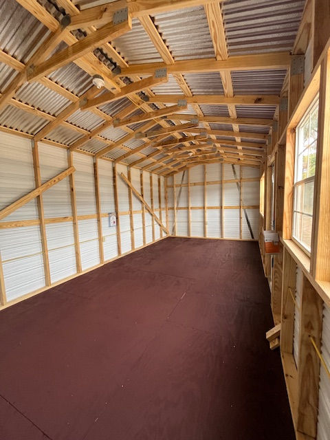 This 12 x 24 cottage boasts tons of natural light with four grid-pattern windows, screens included, and a 9-lite residential-grade solid core entry door. This building is prewired for electrical hookup and has four outlets, two interior lights, and an outside porch light. The exterior looks sharp with white metal siding, Black trim, and a silver reflective roof. The interior walls are 7 ft tall, giving you extra headroom. Serial 17756